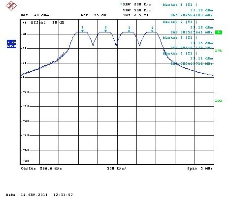下面針對一款掃描機的測試進行介紹,該產品調制方式為ASK,功率為30±3dBm,有效工作頻點為:865.7MHz,866.3MHz,866.9MHz,867.5MHz。