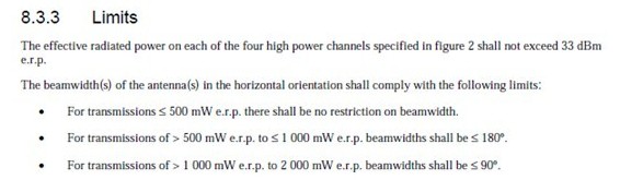 3:1000mW至2000mW erp的,其發(fā)射機射束帶寬不超過90°。