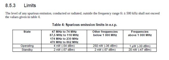 雜散發(fā)射的測試需要測試工作模式與待機模式,其限值有所不同,如下標所示: