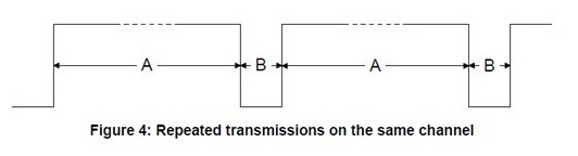 定義為發(fā)射機持續(xù)發(fā)射的周期時間,目的是驗證是否其在有效的進行發(fā)射。通過驗證產品的持續(xù)發(fā)射時間與停止發(fā)射的時間,來判斷其是否符合標準中的要求。持續(xù)發(fā)射時間A不能大于4S,發(fā)射間隙B不能小于100ms.