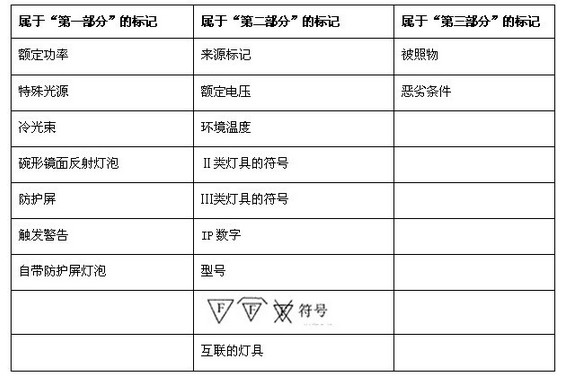 第一部分:換光源時(shí)要看的標(biāo)記應(yīng)在燈具外表面( 安裝面除外) 看得到,或在換光源時(shí)隨光源一起卸下的罩蓋反面看得到。
