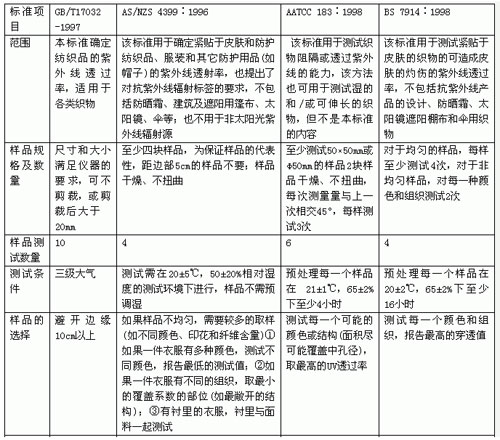 1)測試原理基本相同。紫外線的波長分為UV-A、UV-B和UV-C三個(gè)波段,其中UV-A和UV-B對人體的影響最大。GB/T 17032為UV-B波段(主峰波長297nm)的透過率;AS/NZS4399、AATCC183、BS7914為UV-A和UV-B兩個(gè)波段的UFF值或透過率。